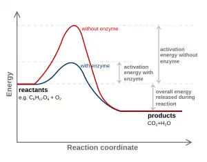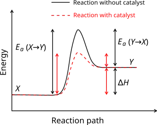 A substance that modifies the transition state to lower the activation energy is termed a catalyst; a catalyst composed only of protein and (if applicable) small molecule cofactors is termed an enzyme. A catalyst increases the rate of reaction without being consumed in the reaction.[8] In addition, the catalyst lowers the activation energy, but it does not change the energies of the original reactants or products, and so does not change equilibrium.[9] Rather, the reactant energy and the product energy remain the same and only the activation energy is altered (lowered).