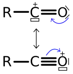 Acylium ions are cations of the formula RCO+.[2] The carbon–oxygen bond length in these cations is near 1.1 Å (110-112 pm), which is shorter than the 112.8 pm of carbon monoxide and indicates triple-bond character.[3][4][5]