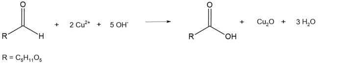 Aldonic acids are the products of the oxidation of aldoses by Benedict's or Fehling's reagents.[6] Copper ions react with an aldose to form a red precipitate, Cu2O.