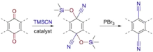 - Cyanide ions facilitate the coupling of dibromides. Reaction of α,α′-dibromoadipic acid with sodium cyanide in ethanol yields the cyano cyclobutane:[18]