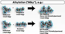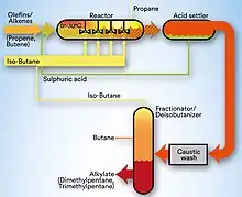 An alkylation unit (alky) is one of the conversion processes used in petroleum refineries. It is used to convert isobutane and low-molecular-weight alkenes (primarily a mixture of propene and butene) into alkylate, a high octane gasoline component. The process occurs in the presence of an acid such as sulfuric acid (H2SO4) or hydrofluoric acid (HF) as catalyst. Depending on the acid used, the unit is called a sulfuric acid alkylation unit (SAAU) or hydrofluoric acid alkylation unit (HFAU). In short, the alky produces a high-quality gasoline blending stock by combining two shorter hydrocarbon molecules into one longer chain gasoline-range molecule by mixing isobutane with a light olefin such as propylene or butylene from the refinery's fluid catalytic cracking unit (FCCU) in the presence of an acid catalyst.[1]
