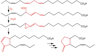 Despite the esoteric character of synthetic allene oxides, allene oxides occur naturally. They are intermediates in the chemical defense of some plants against attack by herbivores. Specifically, a hydroperoxide of linolenic acid is the substrate for the enzyme allene oxide synthase. The resulting allene oxide in turn is converted by allene oxide cyclase to jasmonic acid.[2]