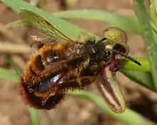 An allomone (from Ancient Greek ἄλλος allos "other" and pheromone) is a type of semiochemical produced and released by an individual of one species that affects the behaviour of a member of another species to the benefit of the originator but not the receiver.[1] Production of allomones is a common form of defense against predators, particularly by plant species against insect herbivores. In addition to defense, allomones are also used by organisms to obtain their prey or to hinder any surrounding competitors.[2]
