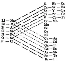 John Gladstone, a fellow chemist, objected on the basis that Newland's table presumed no elements remained to be discovered. "The last few years had brought forth thallium, indium, caesium, and rubidium, and now the finding of one more would throw out the whole system."[9] He believed there was as close an analogy between the metals named in the last vertical column as in any of the elements standing on the same horizontal line.