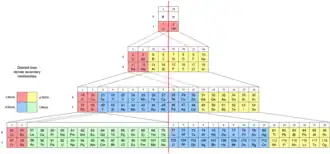 - 1953 — Kapustinsky's table: Electron and neutron added to period 0; each period repeats once. There is a secondary diagonal relationship between the neutron (which decays to a proton, electron and antineutrino), and hydrogen.[26]