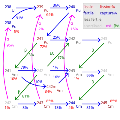 242mAm is fissile and has a low critical mass, comparable to that of 239Pu.[12] It has a very high cross section for fission, and is quickly destroyed if it is produced in a nuclear reactor. Work has been done investigating if this isotope could be used for a novel type of nuclear rocket.[13][14]
