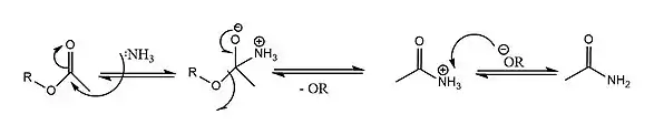 This mechanism[7] is similar to the hydrolysis of esters, the ammonia attacks the electrophilic carbonyl carbon forming a tetrahedral intermediate. The reformation of the C-O double bond ejects the ester. The alkoxide deprotonates the ammonia forming an alcohol and amide as products.[8]
