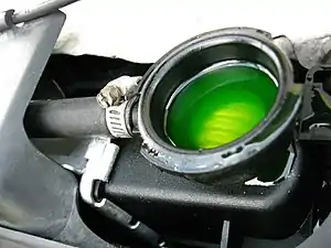 Disodium fluorescein dye is added to conventional ethylene glycol formulas to visually distinguish leaked amounts from other vehicle fluids, and as a marker of type to distinguish it from incompatible types.[19] This dye fluoresces bright green when illuminated by blue or UV light from daylight or testing lamps.