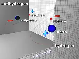 ) is the antimatter counterpart of hydrogen. Whereas the common hydrogen atom is composed of an electron and proton, the antihydrogen atom is made up of a positron and antiproton. Scientists hope that studying antihydrogen may shed light on the question of why there is more matter than antimatter in the observable universe, known as the baryon asymmetry problem.[1] Antihydrogen is produced artificially in particle accelerators.