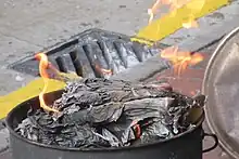 Cremation ashes, also called cremated remains or "cremains," are the bodily remains left from cremation.[7] They often take the form of a grey powder resembling coarse sand. While often referred to as ashes, the remains primarily consist of powdered bone fragments due to the cremation process, which eliminates the body's organic materials.[8][9] People often store these ashes in containers like urns, although they are also sometimes buried or scattered in specific locations.[10]