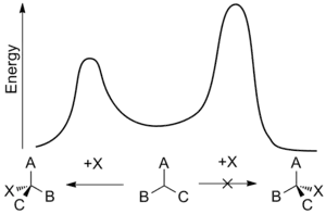 As such enantioselective synthesis is of great importance but it can also be difficult to achieve. Enantiomers possess identical enthalpies and entropies and hence should be produced in equal amounts by an undirected process – leading to a racemic mixture. Enantioselective synthesis can be achieved by using a chiral feature that favors the formation of one enantiomer over another through interactions at the transition state. This biasing is known as asymmetric induction and can involve chiral features in the substrate, reagent, catalyst, or environment[9] and works by making the activation energy required to form one enantiomer lower than that of the opposing enantiomer.[10]