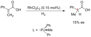 Metal-catalysed enantioselective synthesis was pioneered by William S. Knowles, Ryōji Noyori and K. Barry Sharpless; for which they would receive the 2001 Nobel Prize in Chemistry. Knowles and Noyori began with the development of asymmetric hydrogenation, which they developed independently in 1968. Knowles replaced the achiral triphenylphosphine ligands in Wilkinson's catalyst with chiral phosphine ligands. This experimental catalyst was employed in an asymmetric hydrogenation with a modest 15% enantiomeric excess. Knowles was also the first to apply enantioselective metal catalysis to industrial-scale synthesis; while working for the Monsanto Company he developed an enantioselective hydrogenation step for the production of L-DOPA, utilising the DIPAMP ligand.[56][57][58]