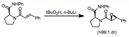 Aryl alkyl (E)-enones have been epoxidized with high enantioselectivity using stoichiometric zinc peroxide systems.[6] Polyleucine may be used with these substrates as well;[18] when an existing stereocenter in the substrate biases the sense of selectivity of the epoxidation, polyleucine is able to overcome this bias.