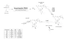 The gene cluster for biosynthesis of avermectin from S. avermitilis has been sequenced.[20] The avermectin biosynthesis gene cluster encodes enzymes responsible for four steps of avermectin production: 1) production of the avermectin aglycon by polyketide synthases, 2) modification of the aglycon, 3) synthesis of modified sugars, and 4) glycosylation of the modified avermectin aglycon. This gene cluster can produce eight avermectins which have minor structural differences.[1]