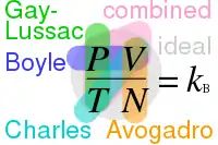 Relationships between Boyle's, Charles's, Gay-Lussac's, Avogadro's, combined and ideal gas laws, with the Boltzmann constant k = R/NA = nR/N (in each law, properties circled are variable and properties not circled are held constant)