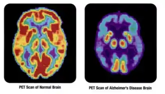 Compounds containing fluorine-18, a radioactive isotope that emits positrons, are often used in positron emission tomography (PET) scanning, because the isotope's half-life of about 110 minutes is usefully long by positron-emitter standards. One such radiopharmaceutical is 2-deoxy-2-(18F)fluoro-D-glucose (generically referred to as fludeoxyglucose), commonly abbreviated as 18F-FDG, or simply FDG.[22] In PET imaging, FDG can be used for assessing glucose metabolism in the brain and for imaging cancer tumors. After injection into the blood, FDG is taken up by "FDG-avid" tissues with a high need for glucose, such as the brain and most types of malignant tumors.[23] Tomography, often assisted by a computer to form a PET/CT (CT stands for "computer tomography") machine, can then be used to diagnose or monitor treatment of cancers, especially Hodgkin's lymphoma, lung cancer, and breast cancer.[24]