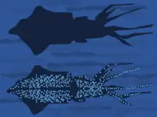 In many animals of the deep sea, including several squid species, bacterial bioluminescence is used for camouflage by counterillumination, in which the animal matches the overhead environmental light as seen from below.[49] In these animals, photoreceptors control the illumination to match the brightness of the background.[49] These light organs are usually separate from the tissue containing the bioluminescent bacteria. However, in one species, Euprymna scolopes, the bacteria are an integral component of the animal's light organ.[50]