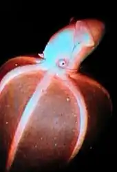 Bioluminescence is used in a variety of ways and for different purposes. The cirrate octopod Stauroteuthis syrtensis uses emits bioluminescence from its sucker like structures.[51] These structures are believed to have evolved from what are more commonly known as octopus suckers. They do not have the same function as the normal suckers because they no longer have any handling or grappling ability due its evolution of photophores. The placement of the photophores are within the animals oral reach, which leads researchers to suggest that it uses it bioluminescence to capture and lure prey.[52]