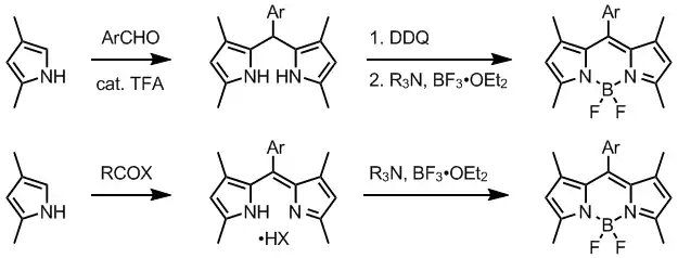 The dipyrromethene precursors are accessed from a suitable pyrrole derivatives by several methods. Normally, one alpha-position in employed pyrroles is substituted and the other is free. Condensation of such pyrrole, often available from Knorr pyrrole synthesis, with an aromatic aldehyde in the presence of trifluoroacetic acid gives dipyrromethane, which is oxidized to dipyrromethene using a quinone oxidant such as DDQ[1] or p-chloranil.[6]
