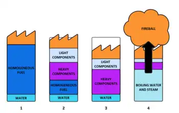 Pure chemical species are not liable to boilover. In order for one to occur, the material must be a mixture of species with sufficiently diverse boiling points. Crude oil and some commercial hydrocarbon mixtures, such as kerosene and some diesel oils, are examples of such materials.[2] The fact that these are stored in large atmospheric tanks in refineries, tank farms, power stations, etc. makes boilover a hazard of interest in terms of process safety.[6][7] During a pool fire, a distillation process takes place in the fuel. Separation of light components from heavier ones occurs thanks to convective fluid motion. An intermediate fuel layer, called the hot zone or heat wave, is formed, which becomes progressively richer in higher-boiling-point species. Its temperature, as well as thickness, progressively increase. Its lower boundary moves downwards towards the fuel–water interface at a speed higher than the overall level of fuel decreases due to the fire burning it. As a result, when the hot zone reaches the water layer, a considerable amount of unburnt fuel may still be present above the water. Upon the water contacting the hot zone, some steam forms. The resulting turbulence promotes mixing of the water into the hot fuel. This can result in rapid water vaporization. The violent expansion of the steam bubbles will push out a significant part of the fuel above it, causing a violent overflow of flaming liquid.[5] In these conditions water may be superheated, in which case part of it goes through a explosive boiling with homogeneous nucleation of steam. When this happens, the abruptness of the expansion further enhances the expulsion of blazing fuel.[8][9][10] Typical hot-zone speeds are 0.3–0.5 meters per hour (1.0–1.7 ft/h), although speeds of up to 1.2 meters per hour (4.0 ft/h) have been recorded.[11]