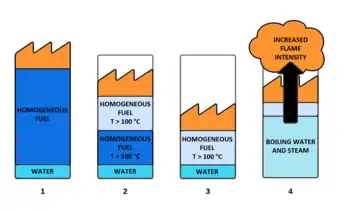 - As mentioned above, the composition of the fuel mixture must be sufficiently varied. It has been observed that the gap between Tboil,max and the higher value between Tboil,min and the boiling point of water at the fuel–water interface has to be higher than 60 °C (108 °F):[12]Some sources indicate that the upper range of the boiling temperature has to be above 149 °C (300 °F):[13][14]