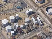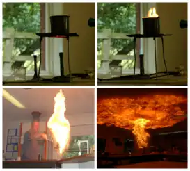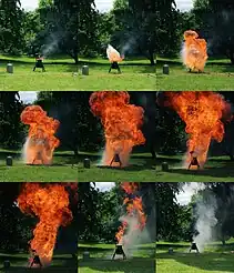 A boilover (or boil-over) is an extremely hazardous phenomenon in which a layer of water under a pool fire (e.g., an open-top tank fire) starts boiling, which results in a significant increase in fire intensity accompanied by violent expulsion of burning fluid to the surrounding areas.[1][2] Boilover can only occur if the liquid fluid is a mixture of different chemical species with sufficiently diverse boiling points, although a so-called thin-layer boilover – a far less hazardous phenomenon – can arise from any water-immiscible liquid fuel. Crude oil, kerosene and some diesel oils are examples of fuels giving rise to boilover.