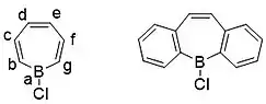 A complication that arises with fusion of the phenyl rings is their positioning. When synthesizing dibenzo[b,f]borepins (b is the carbon next to the boron atom) they are perfectly aligned for conjugation of the borocycloheptatriene ring. However, if the phenyls are positioned in a [c,e] fashion (see below) then the resulting compound is less stable than dibenzo[b,f]borepins by around 34 kcal/mol, quite a large energy difference.[17]