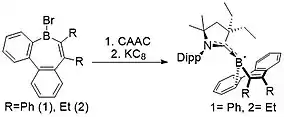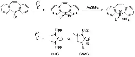 Using the concept of zwitterions, Gilliard et al. was recently able to synthesize and characterize a cationic borepin state using N-heterocyclic carbenes (NHCs) and cyclic(alkyl)(amino)carbenes (CAACS). Due to the dative donation of NHCs and CAACs, boron has only two covalent bonds, giving it a formal positive charge.[8]