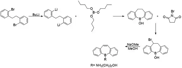 The first synthesis of a stable borepin was reported in 1960 by van Tamelen, Brieger, and Untch. The synthesis began with a lithiation of o,o’-dibromobibenzyl. Next it was reacted with tributyl borate to yield a fused borinic acid ring. This product was reacted with n-bromosuccinimide (NBS) to yield a bromo-substituted product. Finally, they performed a dehydrohalogenation to yield the borepin ring system seen above.[10] A method similar to this involving a tin-boron exchange is commonly used in modern synthesis of fused borepin systems.[11]