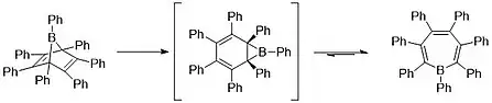 Eisch and Galle isolated the first non-fused borepin in 1975. The heptaphenyl borabicycloheptadiene on the left went through a suprafacial sigmatropic rearrangement, leading to the intermediate in the middle. This intermediate subsequently underwent disrotatory ring opening to yield heptaphenylborepin on the right.[6][12] The isolated borepin is kinetically stabilized by the bulky phenyl groups bound to all seven positions on the ring, protecting it from reactions with moisture in the air. However, like most borepins, this compound reacted with oxygen, turning from fluorescent green to purple.[6][13]