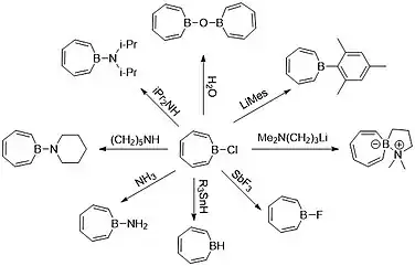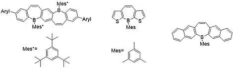 Borepins are a class of boron-containing heterocycles used in main group chemistry. They consist of a seven-membered unsaturated ring with a tricoordinate boron in it. Simple borepins are analogues of cycloheptatriene, which is a seven-membered ring containing three carbon-carbon double bonds, each of which contributes 2π electrons for a total of 6π electrons. Unlike other seven-membered systems such as silepins and phosphepins, boron has a vacant p-orbital that can interact with the π and π* orbitals of the cycloheptatriene.[1][2][3] This leads to an isoelectronic state akin to that of the tropylium cation, aromatizing the borepin while also allowing it to act as a Lewis acid.[3] The aromaticity of borepin is relatively weak compared to traditional aromatics such as benzene or even cycloheptatriene, which has led to the synthesis of many fused, π-conjugated borepin systems over the years.[2][3][4][5][6][7] Simple and complex borepins have been extensively studied more recently due to their high fluorescence and potential applications in technologies like organic light-emitting diodes (OLEDs) and photovoltaic cells.[3][5][7][8][9]