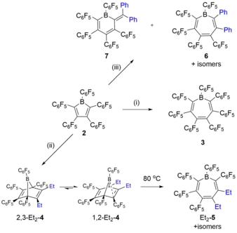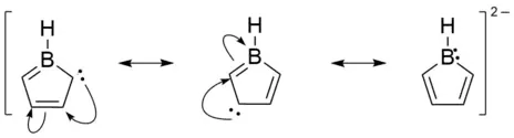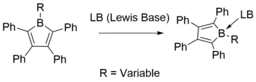 The parent unsubstituted compound with the chemical formula C4H4BH has yet to be isolated outside a coordination sphere of transition metals.[2] Substituted derivatives, which have been synthesized, can have various substituents at the 4 carbons and boron.[3] The high electron deficiency leads to various reactivities such as metal free hydrogen activation and rearrangements upon cycloaddition which are unobserved in other structural analogues like pyrrole or furan.