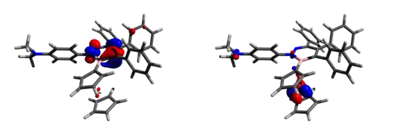 The highly reactive nature of boroles also leads to them participating in ring expansion[28] reactions upon reaction with azides.[29] In the reaction of 1‐(2,3,4,5‐tetraphenylborolyl)ferrocene[4] with 4‐azido‐N,N‐dimethylaniline to generate a new species (8 in the figure above). Cyclic voltametry studies indicated that the 1,2,3‐diazaborinine exhibits similar electronic effects to that of pyridine, which makes (8) weakly electron‐withdrawing. Analyses of the frontier molecular orbitals using DFT shows that the HOMO mainly comprises the iron dx2-y2 orbital while the LUMO resides largely on the BN pyridine ring as an antibonding π* orbital. As (8) contains two nucleophilic nitrogen lone pairs, NBO calculations were performed to assess the charges at nitrogen and determine which might be the more reactive. Results show that the partial charges of the pyridine and dimethylamino nitrogen atoms are -0.232 and -0.446 respectively, suggesting a larger accumulation of electron density on the latter group which should make it the more reactive nucleophile.