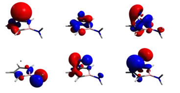 Furthermore, synthetic evidence for a neutral η5‐aminoborole germanium(II) complex half sandwich has been reported[32] as illustrated to the right. Tholen et al. performed DFT calculations at the M06‐2X/Def2‐TZVP level of theory and determined that the model complex matched up closely with experimental data determined experimentally by X-Ray Diffraction (XRD), with a maximum of 1.6% deviation in atomic distances and angles. Using the model compound, its frontier orbitals were calculated and they reveal covalent bonding interactions between the apical germanium atom and the borole base. As shown in the figure to the right, the HOMO is mainly located at the nitrogen atom while HOMO‐1 and HOMO‐2 are bonding combinations of germanium 4px and 4py orbitals with the π orbitals of the borole ring. HOMO‐3 is the antibonding combination of mainly the germanium 4s and 4pz orbitals and the lowest π orbital of the borole ring.
