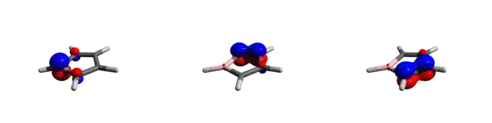 Natural bond orbital (NBO) analysis of C4H4BH has been performed in order to understand the bonding of borole in the familiar Lewis picture.[5] According to the computational results, the occupancy of the two C−C π orbitals is about 1.9, with a tiny amount of electronic charge (an occupancy of 0.13) delocalised on the out-of-plane boron p orbital, illustrated below. The standard Lewis structure of borole captures more than 50% of the overall electronic structure according to Natural Resoanance Theory analysis. As delocalisation of the 4π electrons is prevented by antiaromaticity, the unsaturated boron atom has low occupancy of its vacant pz orbital and is highly Lewis acidic. Along with the low energy LUMO, boroles show an inherent propensity to form Lewis acid–base adducts even with substrates of low donor strengths.
