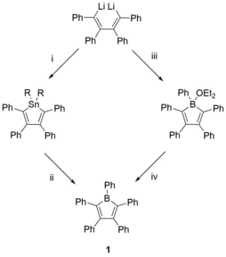 The first borole derivative to be isolated was pentaphenylborole [PhBC4Ph4], synthesised by Eisch et al. in 1969 as a deep blue solid.[10] Referring to the figure below, the practical synthesis of [PhBC4Ph4] (1) was initially accomplished in two different ways:[10][7][11] (a) by direct reaction of 1,4-dilithio-1,2,3,4-tetraphenylbutadiene with PhBBr2 which gives a Lewis base adduct of pentaphenylborole (1·OEt2) in diethylether, and subsequent removal of the solvent. (b) By boron–tin exchange between 2,3,4,5-tetraphenylstannole derivatives with PhBCl2.[12] Eisch et al. have demonstrated that the latter method can be expanded to other borole derivatives, even though these species have only been generated in situ.