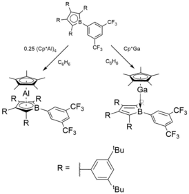Boroles have been experimentally shown to form stable complexes other group 13 elements, such as aluminium and galium.[6] Both were synthesised from the neutral substituted borole and the corresponding metal (I)-Cp* complex in benzene as summarised in below.