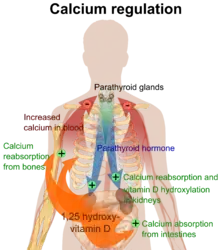 VDR activation in the intestine, bone, kidney, and parathyroid gland cells leads to the maintenance of calcium and phosphorus levels in the blood (with the assistance of parathyroid hormone and calcitonin) and to the maintenance of bone content.[1][20]