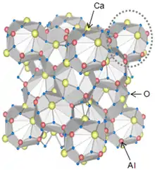 Crystal structure of dodecacalcium hepta-aluminate, 12CaO·7Al2O3 (C12A7).[1]