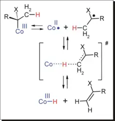 In general, reactions of organic free radicals (•C(CH3)(X)R) with metal-centered radicals (M•) either produce an organometallic complex (reaction 1) or a metal hydride (M-H) and an olefin (CH2=C(X)R) by the metallo radical M• abstracting a β-hydrogen from the organic radical •C(CH3)(X)R (reaction 2).[5] These organo-radical reactions with metal complexes provides several mechanisms to control radical polymerization of monomers CH2=CH(X). A wide range of metal-centered radicals and organo-metal complexes manifest at least a portion of these reactions.[6] Various transition metal species, including complexes of Cr(I),[7][8] Mo(III),[9] Fe(I),[10] V(0),[11] Ti(III),[12] and Co(II)[13][14][15] have been demonstrated to control molecular weights in radical polymerization of olefins.