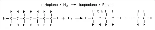 - 4: The hydrocracking of paraffins into smaller molecules as exemplified by the cracking of normal heptane into isopentane and ethane, as shown below: