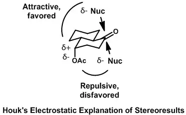 Similarly, in Houk's trans-decalone system, the nucleophile with its partial negative charge prefers to attack away from the partial negative charge of the acyl ester. When this substituent is axial, the equatorial pathway brings the nucleophile into closer proximity and is therefore disfavored.[23] This is less pronounced for equatorially substituted ester because the group is now positioned further away from the carbonyl.[17]
