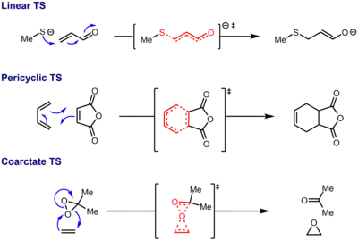 In contrast to these types of reactions, a coarctate reaction is characterized by a doubly cyclic transition state, in which at least one atom undergoes the simultaneous making and breaking of two bonds. Thus, the topology of the transition state of a coarctate reaction is a constricted cycle that meets with itself (resembling a figure eight) while the topology of pericyclic and linear reactions are a circle (or Möbius strip) and line segment, respectively. The concept was first proposed by Rainer Herges.[1][2]