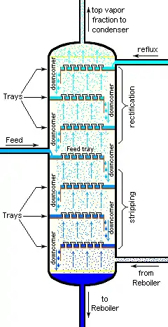 Image 3 depicts a simple continuous fractional distillation tower for separating a feed stream into two fractions, an overhead distillate product and a bottoms product. The "lightest" products (those with the lowest boiling point or highest volatility) exit from the top of the columns and the "heaviest" products (the bottoms, those with the highest boiling point) exit from the bottom of the column. The overhead stream may be cooled and condensed using a water-cooled or air-cooled condenser. The bottoms reboiler may be a steam-heated or hot oil-heated heat exchanger, or even a gas or oil-fired furnace.