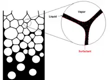 As the foam is formed, it changes in structure. As the liquid foams up into the gas, the foam bubbles begin as packed uniform spheres. This phase is the wet phase. The farther up the column the foam travels, the air bubbles distort to form polyhedral shapes, the dry phase. The liquid that separates the flat faces between two polyhedral bubbles is called the lamellae; it is a continuous liquid phase. The areas where three lamellae meet are called plateau borders. When the bubbles in the foam are the same size the lamellae in the plateau borders meet at 120 degree angles. Since the lamella is slightly curved, the plateau region is at low pressure. The continuous liquid phase is held to the bubble surfaces by the surfactant molecules that make up the solution being foamed. This fixation is important because otherwise the foam becomes very unstable as the liquid drains into the plateau region making the lamellae thin. Once the lamellae become too thin they will rupture.[6]