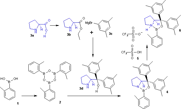 The general outline for the organic synthesis of a CBS catalyst is shown below. The first leg of the reaction sequence starts from the azeotropic dehydration of a boronic acid (1) such as one based on toluene to a boroxine (2). This boroxine reacts with the proline derivative (3d) to form the basic oxazaborolidine CBS catalyst (4). The oxazaborolidine was first developed as a ketone reducing agent by the laboratory of Itsuno, and thus is more properly called the Itsuno-Corey oxazaborolidine. Proline derivative 3d is prepared in a separate leg from a Grignard reaction with Grignard reagent 3c and proline ester 3b. A Lewis acid superacid salt (6) can be obtained with the aid of triflic acid (5). Many other such catalysts exist with different derivatives of these reactants.
