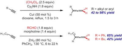 Shengming Ma (麻生明) and coworkers at the Shanghai Institute of Organic Chemistry (SIOC, Chinese Academy of Sciences) investigated the reaction in detail, including clarifying the critical role of the base, and developed conditions that exhibited superior functional-group compatibility and generally resulted in higher yields of the allene. One of the key changes was the use of dicyclohexylamine as the base.[5] In another important advance, the Ma group found that the combination of zinc iodide and morpholine allowed aldehydes besides formaldehyde, including benzaldehyde derivatives and a more limited range of aliphatic aldehydes, to be used as coupling partners, furnishing 1,3-disubstituted allenes via an alkyne-aldehyde coupling method of substantial generality and utility.[6] A separate protocol utilizing copper catalysis and a fine-tuned amine base was later developed to obtain better yields for aliphatic aldehydes.[7]