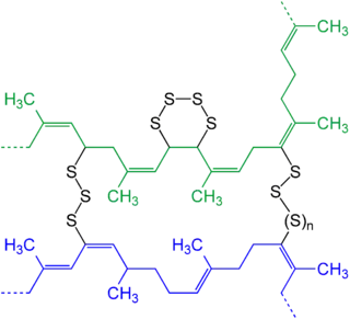In rubber, the curing is also induced by the addition of a crosslinker. The resulting process is called sulfur vulcanization. Sulfur breaks down to form polysulfide cross-links (bridges) between sections of the polymer chains. The degree of crosslinking determines the rigidity and durability, as well as other properties of the material.[5]