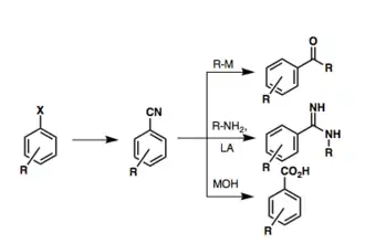 Sandmeyer cyanation is a means of converting aniline derivatives to benzonitriles.[10] The cyanation is generally postulated to be two-electron, while with radical mediators in absence of metals, the reaction is likely radical.[11]