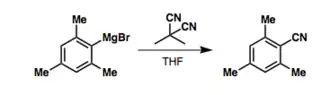 - Reeves, Jonathan (2015). "Transnitrilation from Dimethylmalononitrile to Aryl Grignard and Lithium Reagents: A Practical Method for Aryl Nitrile Synthesis". Journal of the American Chemical Society. 137 (29): 9481–9488. doi:10.1021/jacs.5b06136. PMID 26151426.
